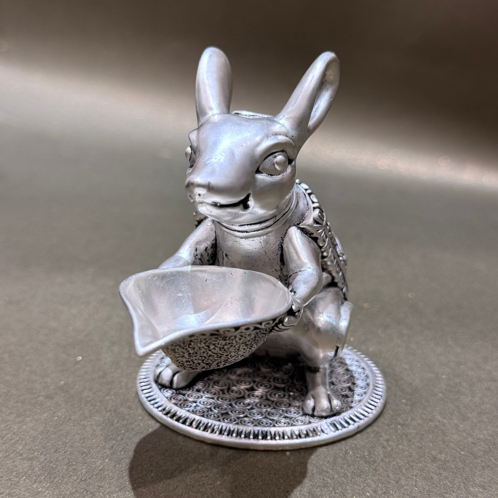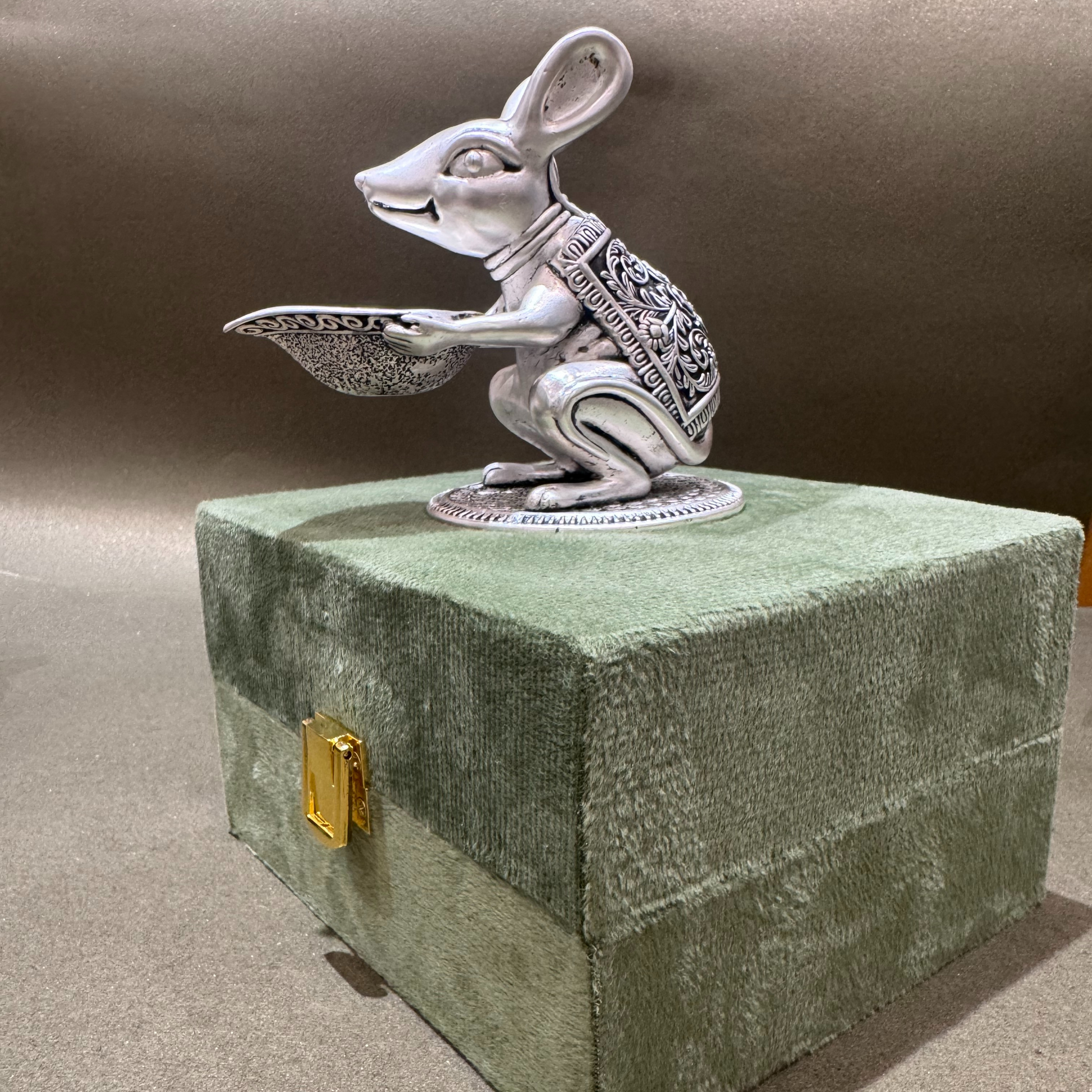 This beautifully crafted silver-plated Mushak (mouse), the sacred vahana of Lord Ganesha, holds a delicately designed diya in its paws. Adorned with intricate carvings on its back and base, the piece radiates both artistic beauty and spiritual symbolism. The diyas finely etched patterns enhance its elegance, making it perfect for festive rituals, home temple d��cor, or as a symbolic gift representing devotion, prosperity, and the removal of obstacles. Its antique silver finish adds timeless charm, making it a standout piece in any sacred or decorative setting.