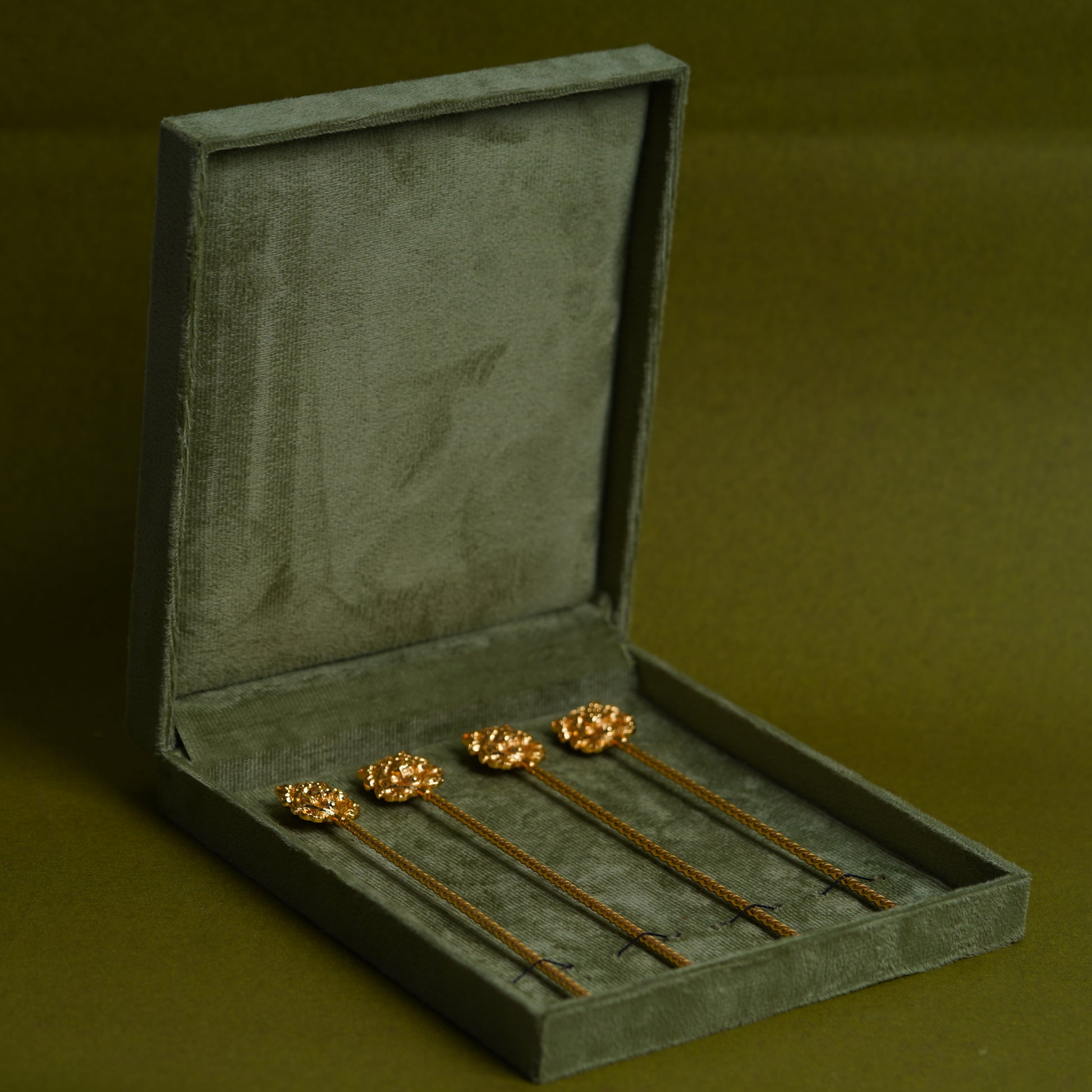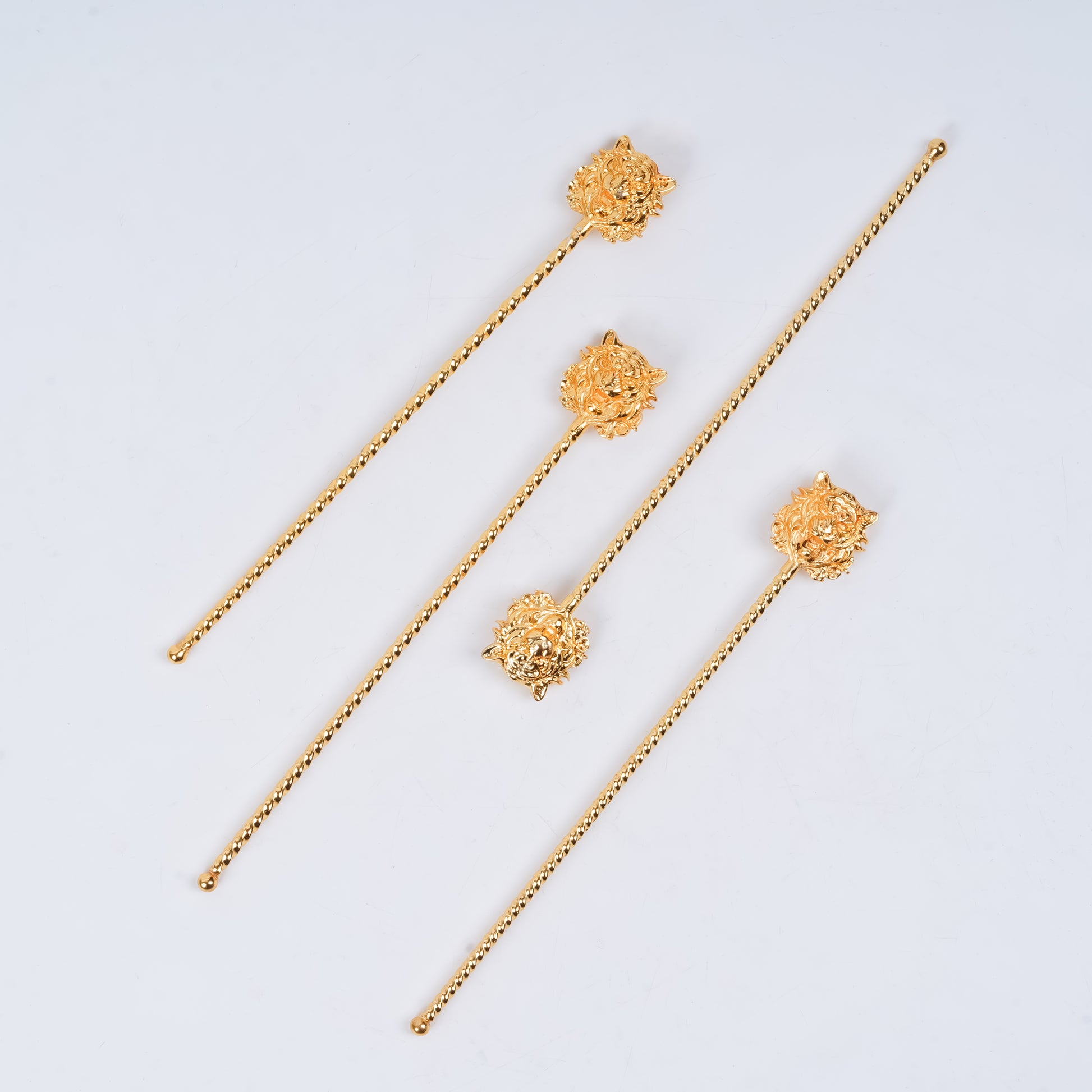 Gold Plated Brass Tiger Head Cocktail Stirrer Set | Luxury Fierce Wild Cat Bar Accessory | Set of 4 | Premium Barware & Gifting